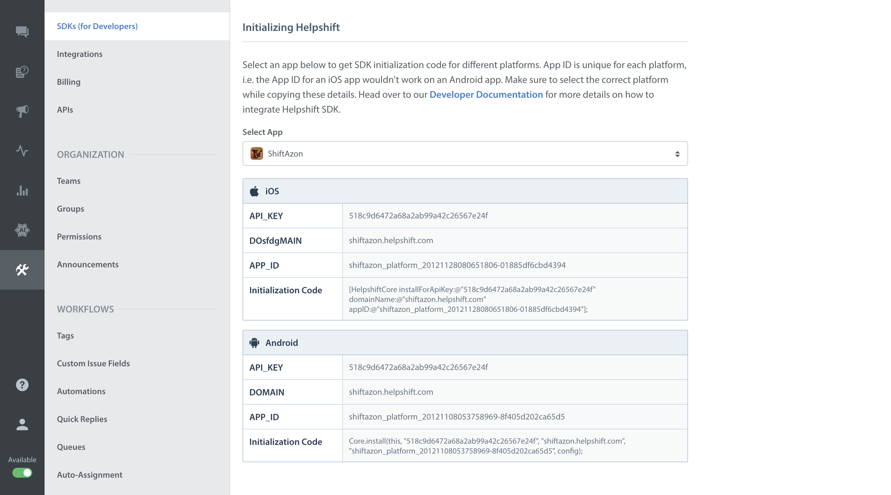 Settings>SDK (for Developers)in your agent dashboard and scroll down to "Initializing Helpshift" section.Select your App from the dropdown and copy the three tokens to be passed when initializing Helpshift.