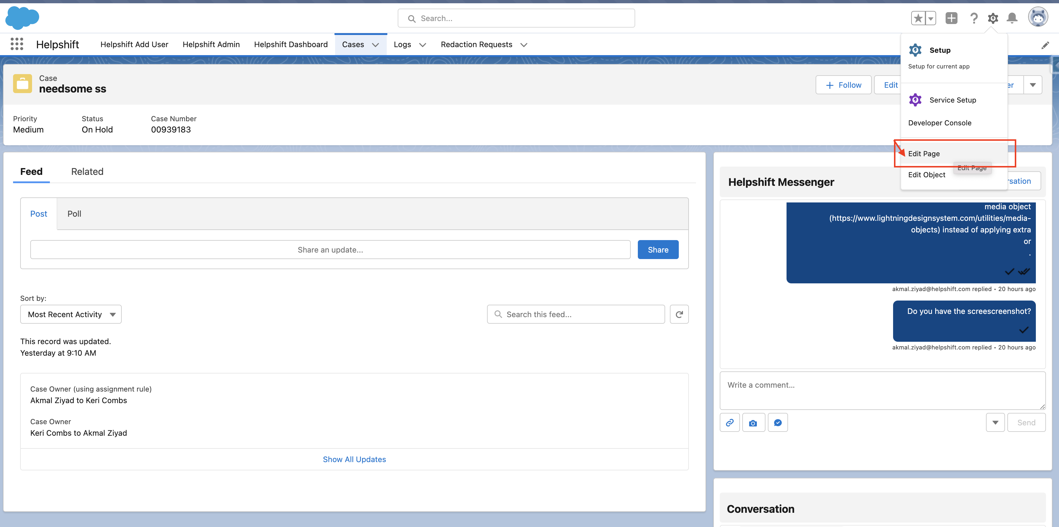 - Manually add the new Helpshift Messenger to the case record page. (Steps for this are described in the next section.)