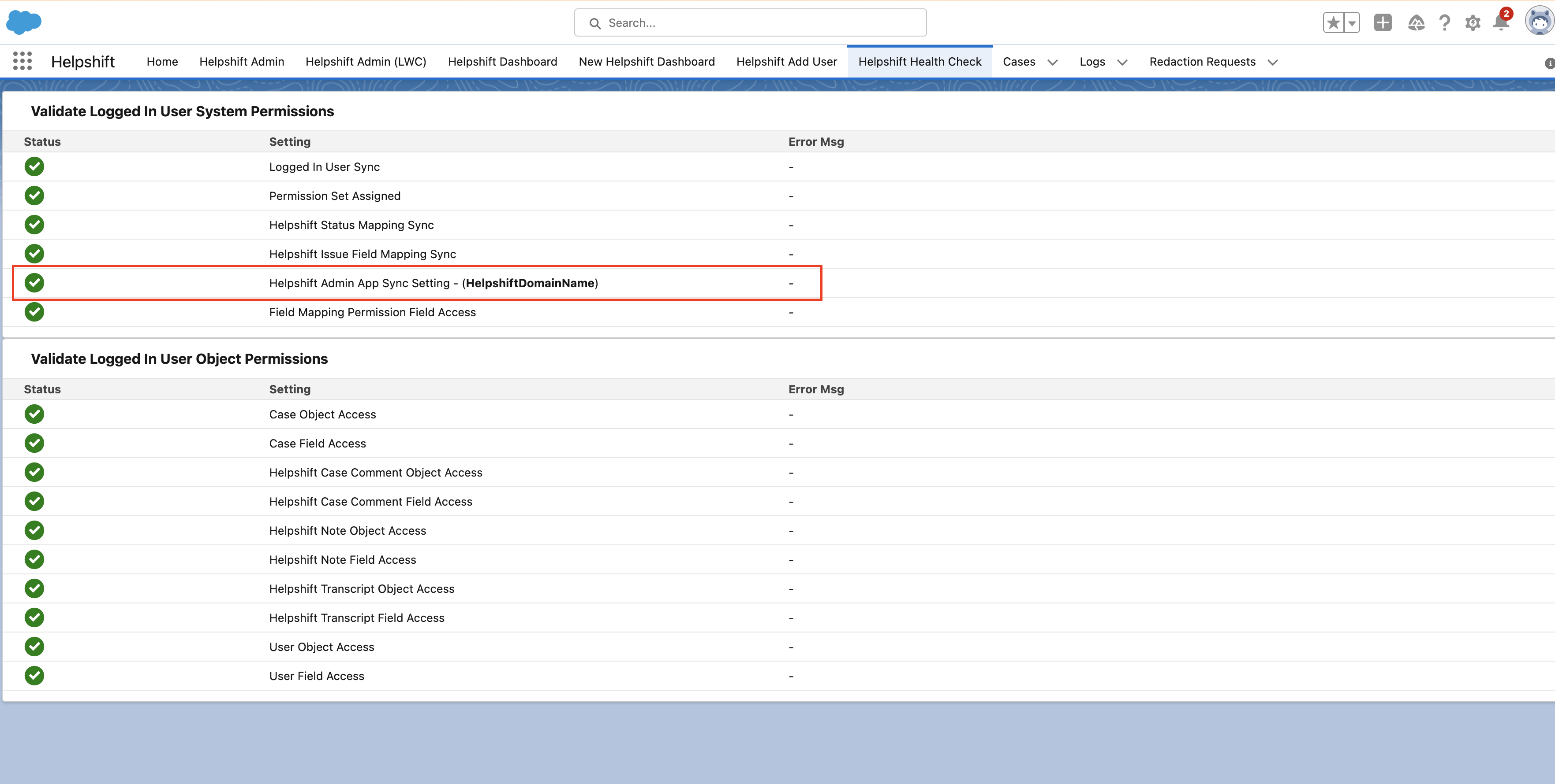 - Click on the Helpshift Health Check tab and ensure there are no errors