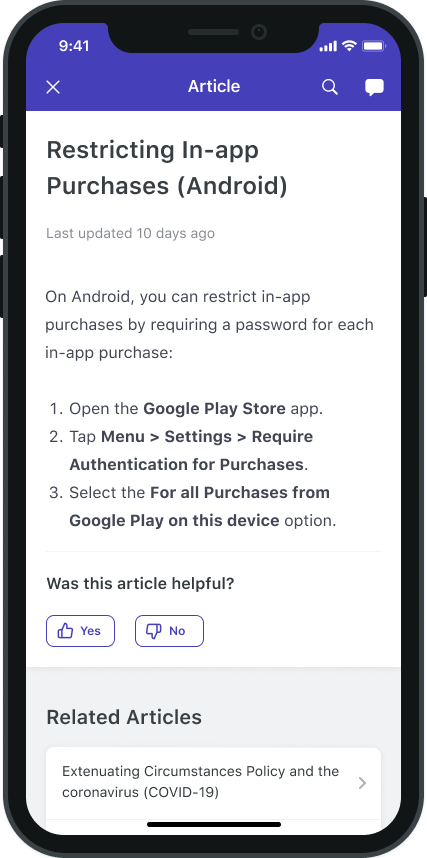 This View Controller combines the FAQ, Search and Contact Us functionality together in a single interface. In this view, a user can search for a specific question in the FAQ failing which they can report an issue. When you respond back to their question from the Helpshift Agent Dashboard, the reply will be shown as a count besides Contact Us, clicking on which will open up the conversation.